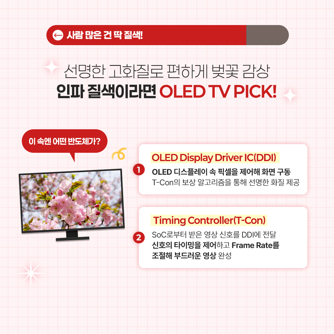 | ➕OLED TV 속 반도체 – OLED Display Driver IC(DDI) : 디스플레이 픽셀을 제어해 색상 표현, T-Con의 보상 알고리즘으로 선명한 화질 구현 – Timing Controller(T-Con) : SoC로부터 전달받은 영상 신호의 타이밍을 제어하고, Frame Rate를 조절 |