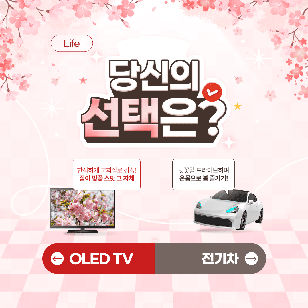 성큼 다가온 벚꽃 시즌🌸 1년에 단 며칠뿐인 이 핑크빛 풍경을 어떻게 즐기고 싶나요? 📺OLED TV로 안방 1열에서 고화질 감상 VS 🚘전기차로 봄바람 맞으며 벚꽃길 드라이브
