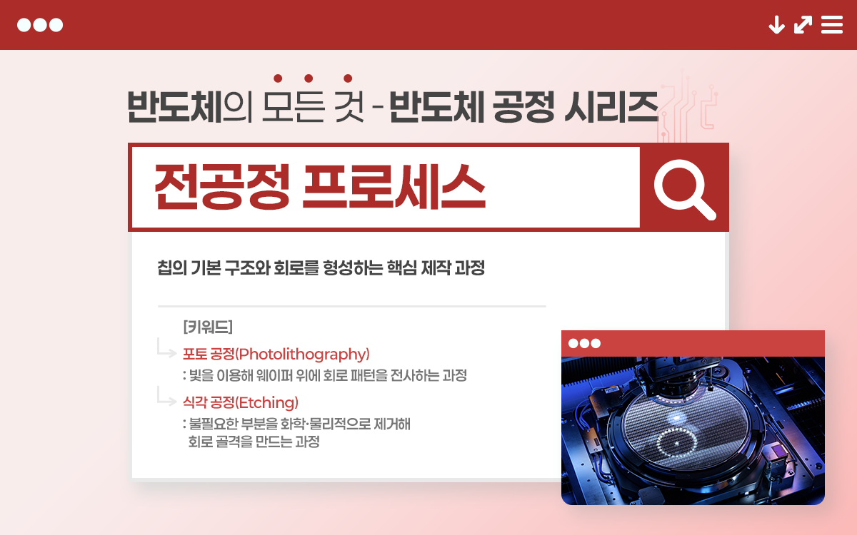 ▪ 전공정(Front-End of Line) : 웨이퍼 위에 나노 단위의 미세 회로를 형성하는 과정.