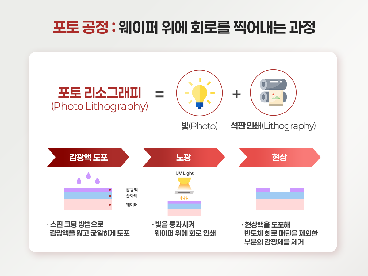 포토 공정은 말 그대로 웨이퍼 위에 빛으로 회로 패턴을 새겨 넣는 과정이에요. ‘포토 리소그래피(Photo Lithography)’라는 이름도 빛(Photo)과 석판 인쇄(Lithography)가 합쳐진 단어에서 나온 만큼, 사진을 인화하듯 회로를 찍어낸다고 이해하면 쉬워요.