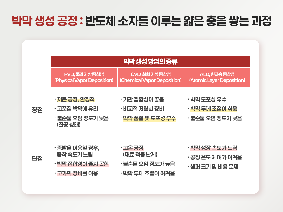 마지막으로 ‘ALD(Atomic Layor Deposition, 원자층 증착법)’은 원자 단위로 박막을 하나씩 쌓아 올리는 기술이에요. 균일도가 뛰어나고 미세 공정에서 특히 강점을 발휘하지만, 증착 속도가 느리고 장비 비용이 높은 편이에요.