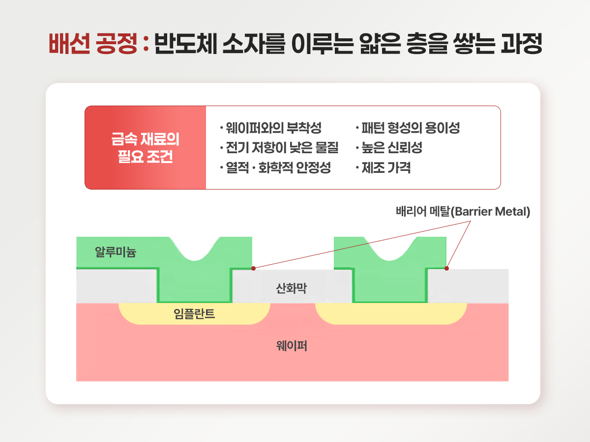 배선 공정은 웨이퍼 위에 새겨진 회로에 금속을 채워 넣는 작업인데, 배선에 쓰이는 금속 재료는 아무거나 선택할 수 없어요. 웨이퍼와 잘 붙어야 하고, 전기 저항이 낮아야 하며, 열적·화학적으로도 안정성이 높아야 한답니다. 또 패턴 형성이 용이하고 신뢰성이 높으면서, 제조 가격도 고려해야 하죠. 대표적으로는 알루미늄(Al)과 구리(Cu)가 널리 쓰이고 있으며, 공정 특성과 요구 성능에 따라 적합한 금속을 선택해 사용해요.
