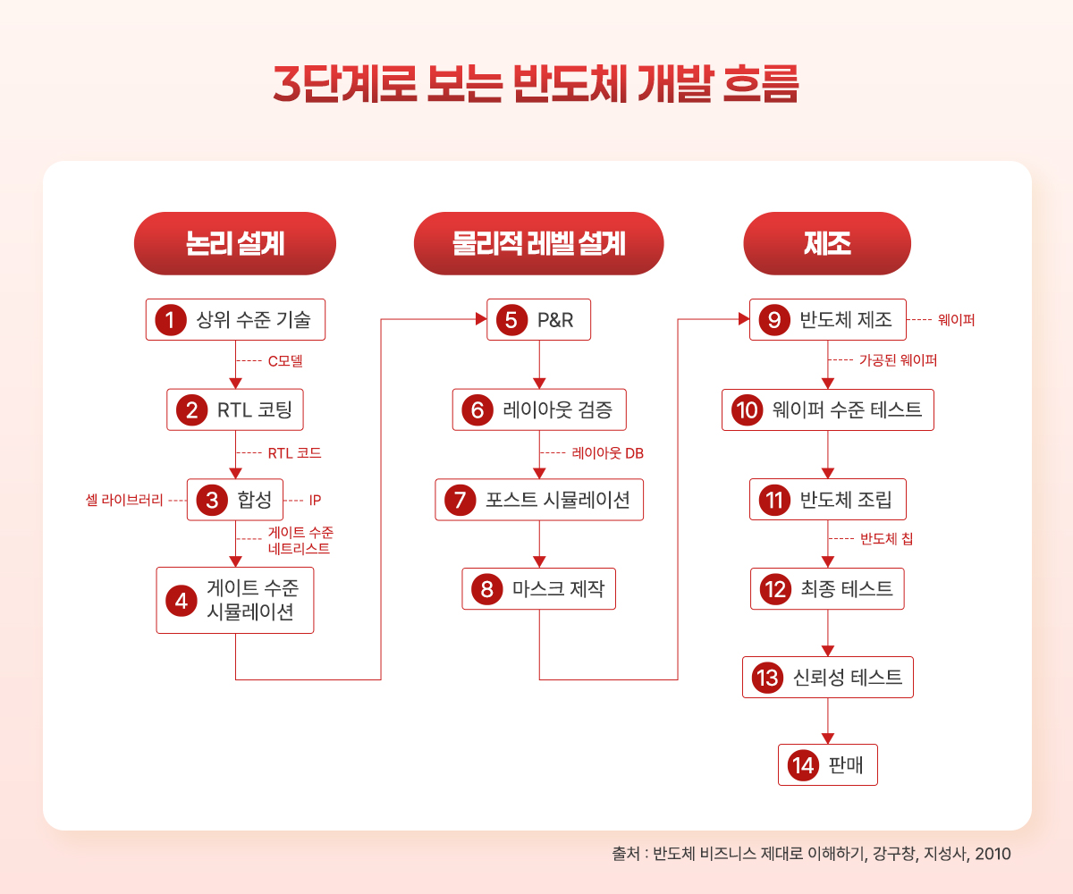 본격적인 분업의 역사를 이야기하기 전에, 반도체가 만들어지는 과정을 간략하게만 짚고 넘어가자. 무형의 아이디어가 어떻게 유형의 칩으로 변환되는지 그 흐름을 이해해야만, 훗날 이 거대한 과정이 어떻게 설계와 제조로, 즉 팹리스와 파운드리로 쪼개질 수 있었는지를 명확히 알 수 있기 때문이다.