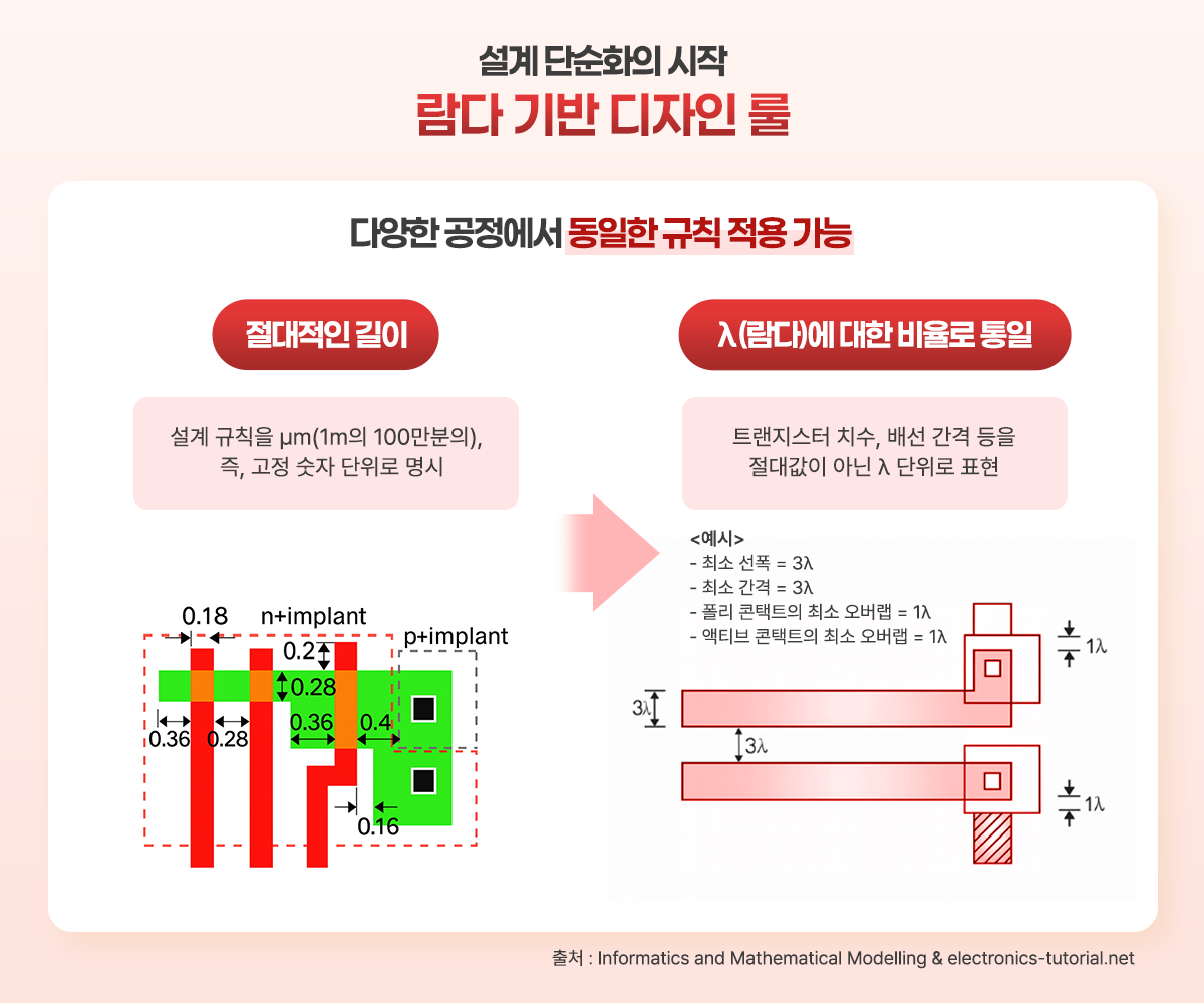 1970년대에는 칩 하나를 설계하기 위해 40페이지가 넘는 레이아웃 설계 규칙을 알고 있어야 했다. 엔지니어들은 창의적인 아이디어보다 복잡하고 까다로운 규칙들과 씨름하는 데 에너지를 쏟아야 했다. 이때 제록스 선행연구소 PARC에서 일하던 콘웨이(Lynn Conway)는 공장마다 제각각이던 수십 페이지의 복잡한 규칙들을 모두 폐기하고, 단 하나의 기본 길이 단위인 ‘람다(λ)’를 기준으로 재정의했다.