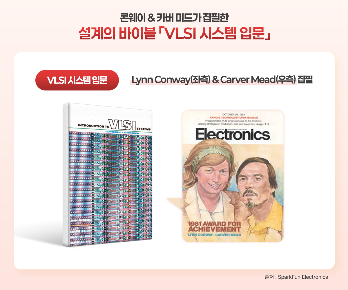 콘웨이는 여기서 멈추지 않았다. 그녀는 카버 미드(Carver Mead) 교수와 함께 ‘VLSI 시스템 입문(Introduction to VLSI Systems)’이라는 책을 집필했는데, 이 책은 훗날 반도체 설계의 ‘바이블’이 되었다. (도표 3은 VLSI 시스템 입문 책의 표지(좌측)와 린 콘웨이 및 카버 미드의 모습(우측) 참조)