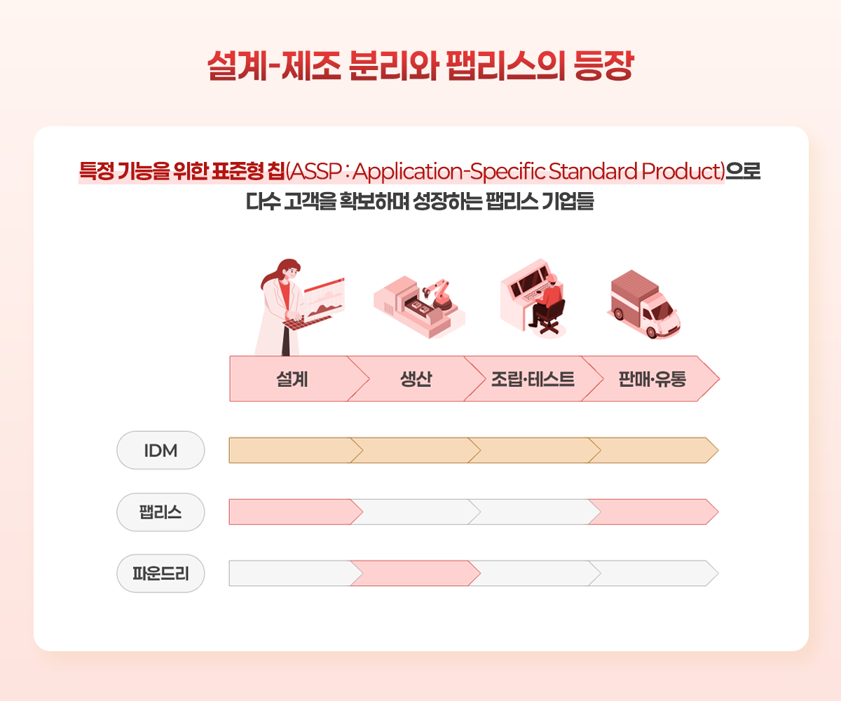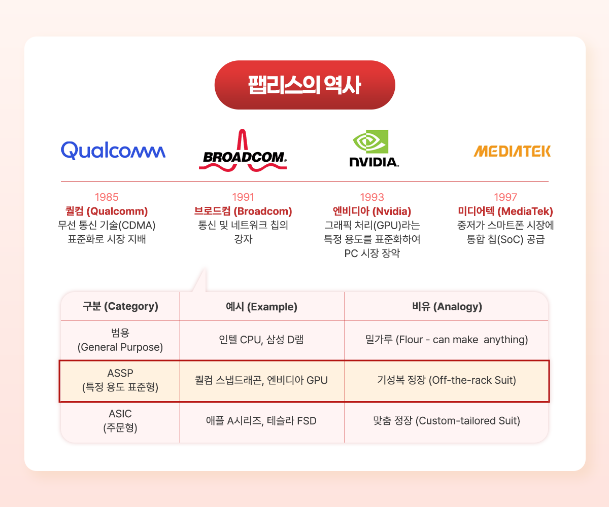 제조의 부담이 사라지자, 공장 없이 설계와 마케팅에만 집중하는 ‘팹리스(Fabless)’ 기업들이 본격적으로 생겨났다. 1985년 무선 통신 기술(CDMA)을 표준화한 퀄컴(Qualcomm)을 시작으로, 1991년에는 통신·네트워크 칩 분야의 브로드컴(Broadcom)이, 1993년에는 그래픽 처리 장치(GPU) 시장을 개척한 엔비디아(Nvidia)가 설립되었다. 이어 1997년에는 통합 칩 솔루션으로 성장한 대만의 미디어텍(MediaTek)이 설립되었다. 여기서 주목해야 할 점은 이들의 성공 방식이 단순한 주문형 반도체(ASIC)가 아닌 ‘특정 용도 표준 제품(ASSP, Application-Specific Standard Product)’이었다는 사실이다. ASIC이 특정 고객 한 곳만을 위한 ‘맞춤 정장’이라면, ASSP는 통신이나 그래픽 같은 특정 기능에 특화되면서도 삼성, LG전자 등 다수의 고객에게 팔 수 있는 고급 ‘기성복’과 같았다.