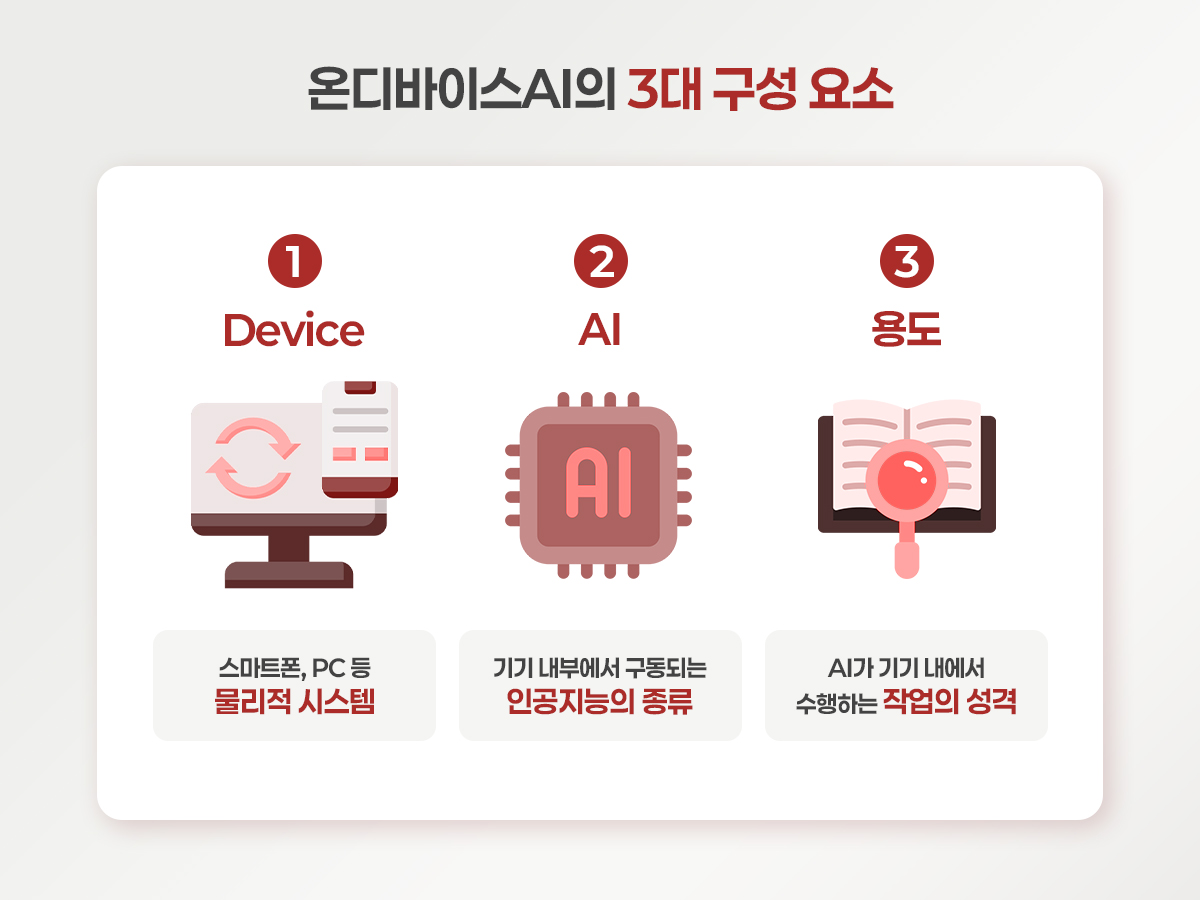이제 기존 클라우드 AI와 온디바이스 AI가 어떻게 다른지 확실히 감이 오시죠? 그렇다면 온디바이스 AI가 우리 기기 안에서 구체적으로 어떻게 구성되어 작동하는지, ‘3가지 핵심 요소’를 함께 알아볼게요!