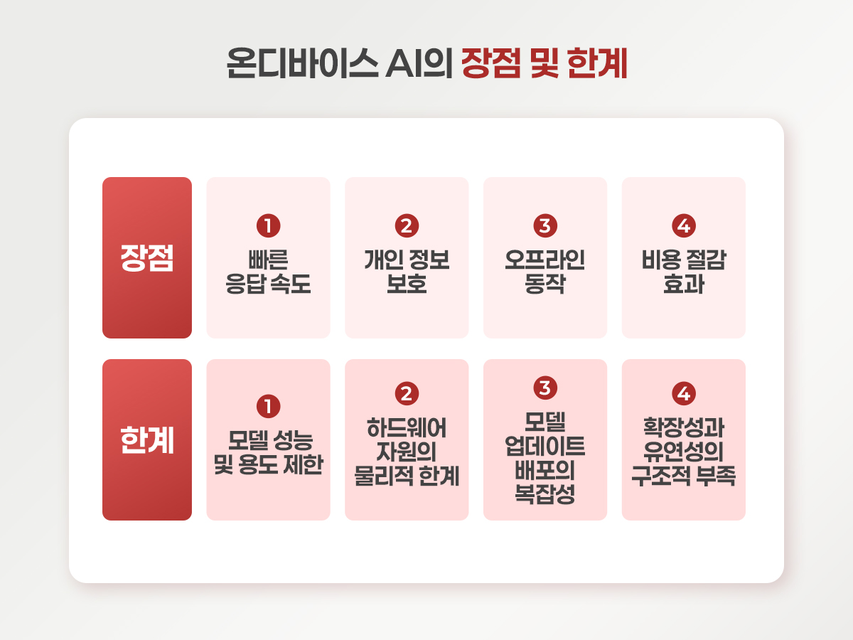 지금까지 오프라인 실시간 반응이나 개인 정보 보호 같은 온디바이스 AI의 매력적인 장점들을 알아보았어요. 하지만 이렇게 좋아 보이는 온디바이스 AI에도 분명히 해결해야 할 한계점들이 존재합니다.