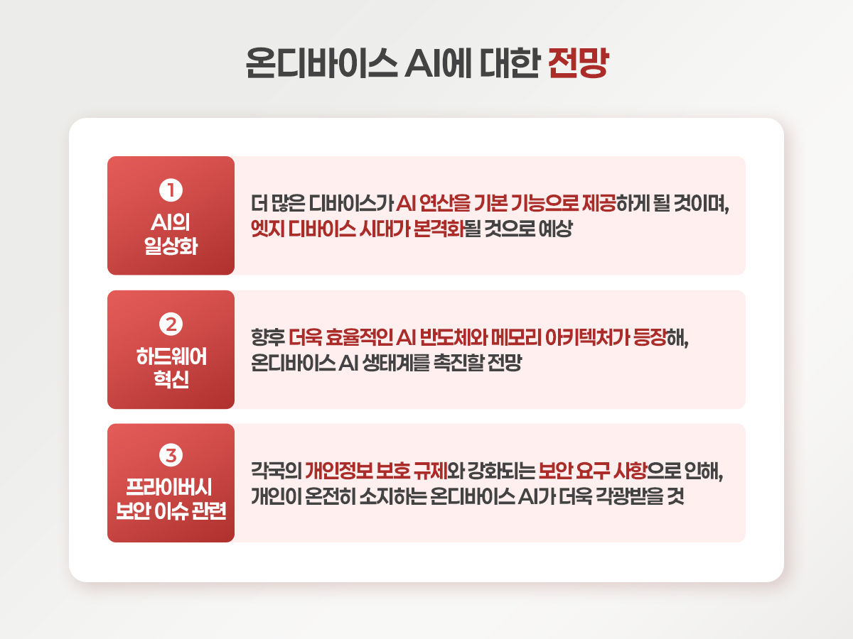 점차 더 많은 디바이스가 AI 연산을 기본 기능으로 제공하게 될 거예요. 이제는 서버를 거치지 않고 일상 속 IT 기기들이 직접 생각하고 판단하는 ‘엣지 디바이스 시대’가 본격적으로 시작되는 것이죠.