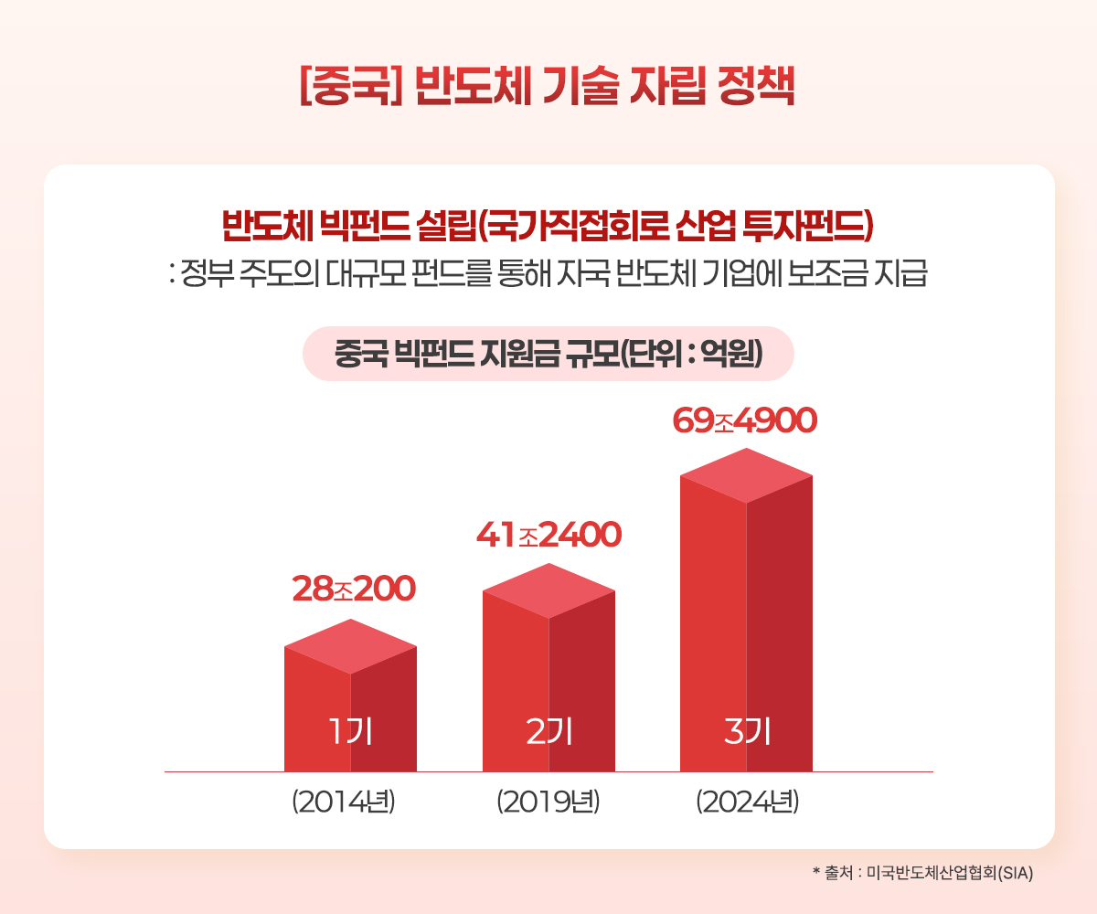 중국은 이에 대항하여 반도체 공급망 자급도를 높이는 정부 주도의 반도체 빅펀드를 이미 10년 넘게 추진하며 자국의 반도체 기업들에게 다양한 형태의 보조금을 지급한다. 중국은 이미 14차 5개년 계획에서 반도체와 AI를 국가 안보 및 제조 경쟁력의 핵심 축으로 못박았고, 빅펀드 뿐만 아니라 지방 정부 혹은 공기관에서 관리하는 반도체 혹은 AI 펀드를 통해 수십조 위안 규모의 자본을 지속 투입해 왔다. 중국의 반도체 자립 정책은 최근 AI 자급 정책과 연계되어 AI 반도체의 자립 정책으로 이어진다.