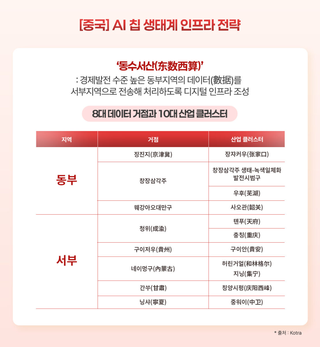 중국의 AI 칩 생태계 인프라 전략은 이른바 ‘동수서산(东数西算, East Data West Compute)’이다. 즉, 신장 지역 같은 중국 서부의 전력 생산 및 부지 여유를 활용하여 대규모 AI 데이터센터를 8개 이상 건설하고, 동부에는 데이터 클러스터를 10개 이상 구축하여, 전력 집약적 AI 데이터센터를 내륙으로 분산하는 국가 프로젝트를 추진하는 셈이다.