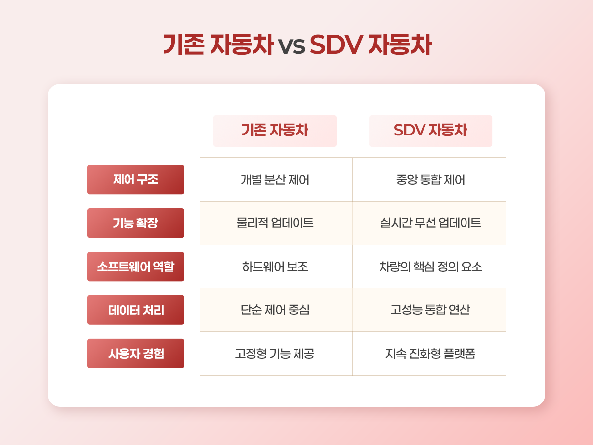 이렇게 SDV는 기존의 자동차와는 작동 방식부터 가치까지 많은 부분이 다르다는 것을 알 수 있어요. 단순히 구조만 바뀐 게 아니라, 우리의 카 라이프 자체를 완전히 새롭게 정의하고 있는데요.