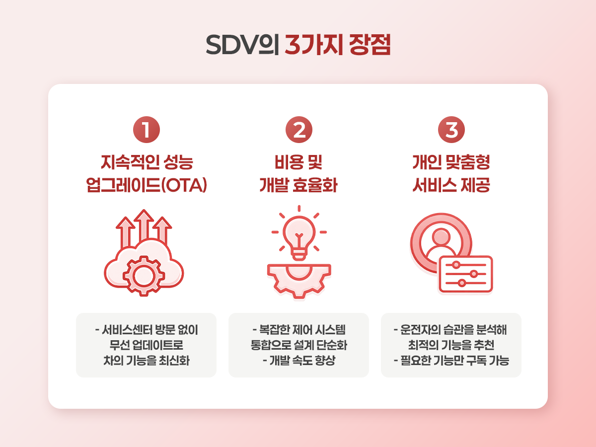 | ➕ SDV 도입의 가치는? – 성능의 확장성: OTA(Over-the-Air) 기술을 기반으로 차량 구매 이후에도 무선으로 성능 및 편의 기능을 상시 업데이트 – 제조 및 개발 효율성: 중앙 집중형 아키텍처를 통해 하드웨어의 복잡성을 낮추고 소프트웨어 개발의 유연성과 속도를 확보 – 사용자 가치 혁신: 데이터 분석을 통한 개인화 서비스와 기능별 구독 모델(FoD)을 도입하여 사용자 중심의 모빌리티 환경을 조성 – 잔존 가치 보존: 지속적인 소프트웨어 개선을 통해 차량 노후화를 방지하고 자산으로서의 가치를 보존 |