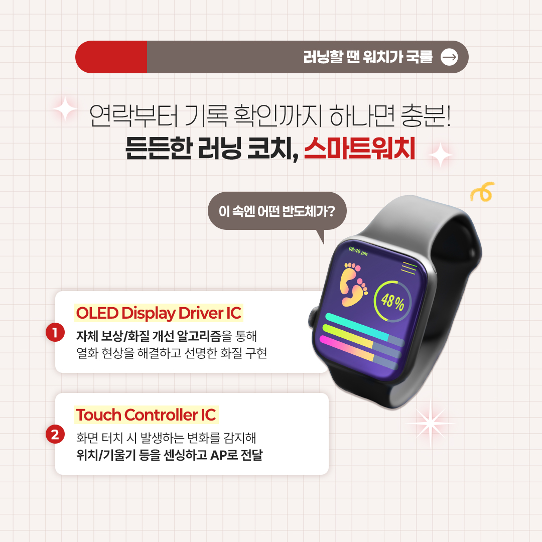 달리는 순간, 기록을 실시간으로 ‘보여주고’, 손끝의 움직임에 맞춰 ‘반응하는’ 스마트 기기 속에는 DDI와 Touch IC가 있어요. 보이지 않는 곳에서 열일하며, 더 편리한 러닝 라이프를 만들어주는 디스플레이 반도체의 존재, 이제 아시겠죠?