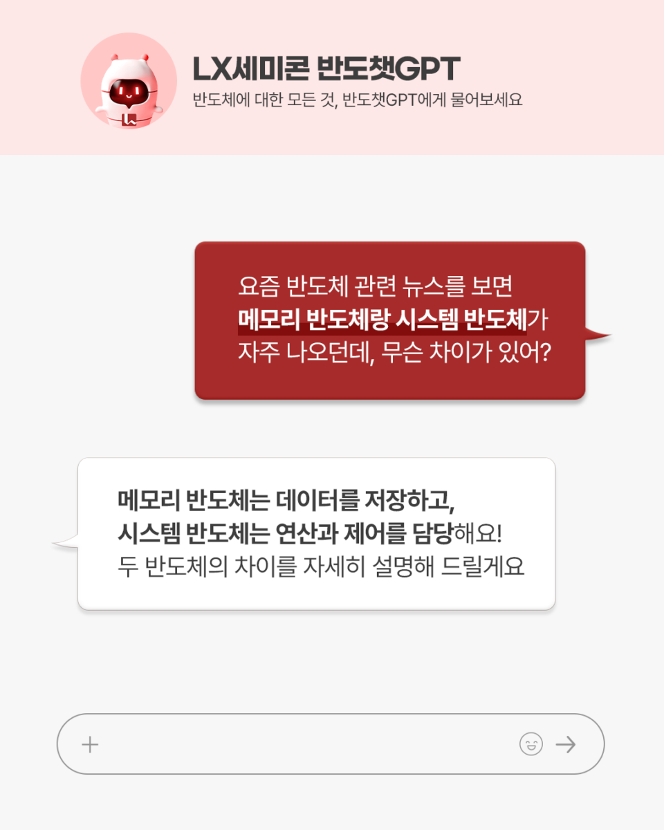 오늘은 같은 반도체라도 역할이 다른 메모리 반도체와 시스템 반도체의 차이에 대해 알아봤어요. 앞으로도 반도체 속 다양한 궁금증을 해결해 줄 반도챗GPT 이야기가 궁금하다면 아래 채널을 통해 만나보세요!