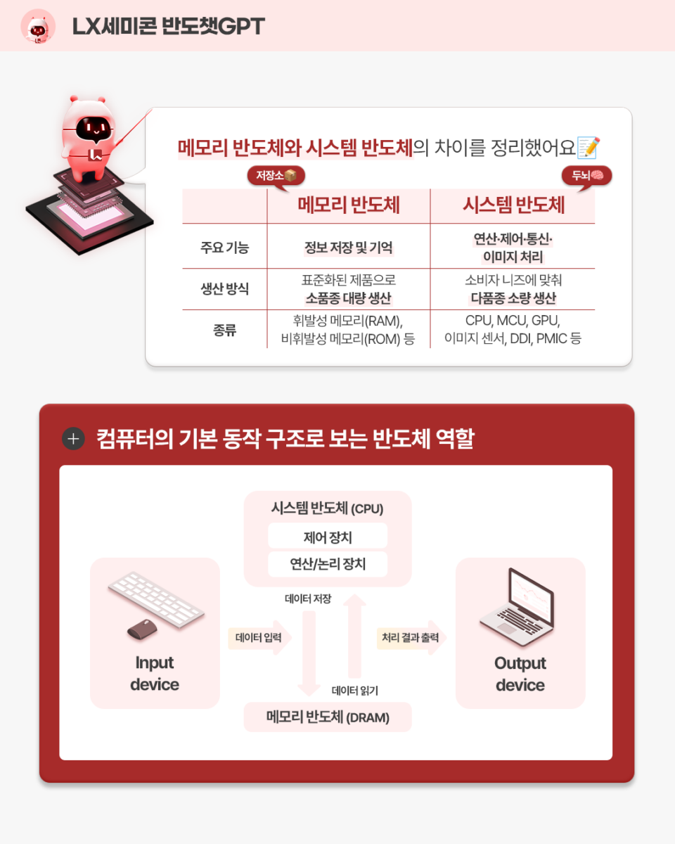 | ➕ 메모리 반도체 vs 시스템 반도체 : 주요 역할과 종류 – 메모리 반도체 : 데이터를 저장하고 기억하는 반도체 (대표 예: RAM, ROM 등) – 시스템 반도체 : 데이터의 연산·제어·통신·이미지 처리를 담당하는 반도체 (대표 예: CPU, MCU, DDI 등) |