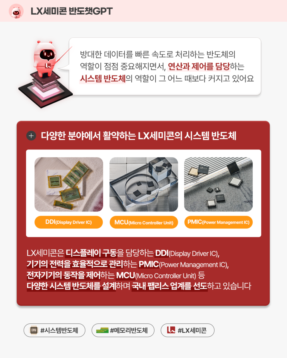LX세미콘은 이러한 DDI(Display Driver IC), T-Con(Timing Controller), PMIC(Power Management IC) 등 다양한 시스템 반도체를 설계하는 팹리스 기업으로 기술 경쟁력을 지속적으로 강화하고 있습니다. 특히 General MCU(가전용) 외 Motor MCU 같은 차량용 IC와 같은 분야로 사업 영역을 확대하며 국내 시스템 반도체 산업의 성장에도 기여하고 있어요!
